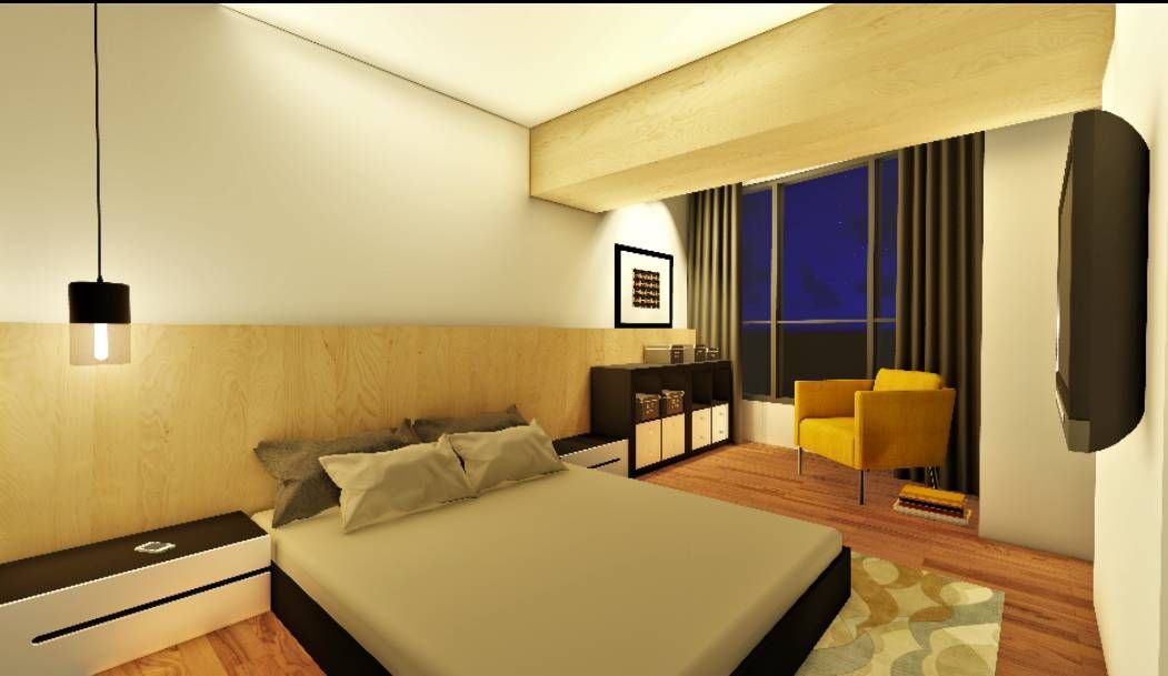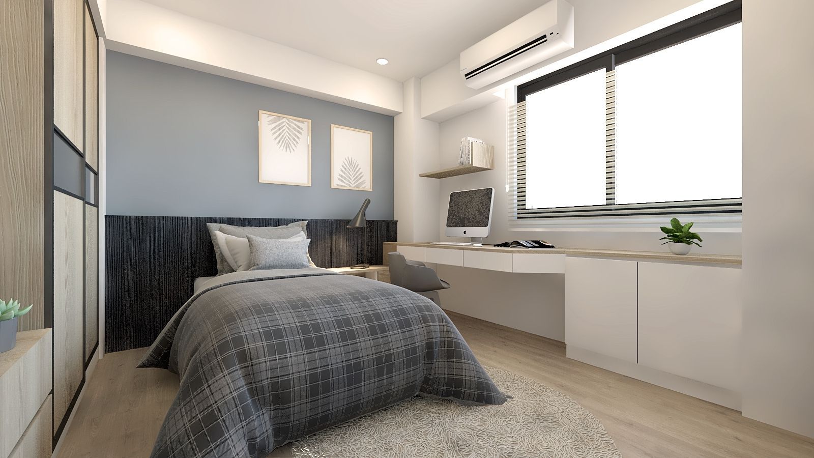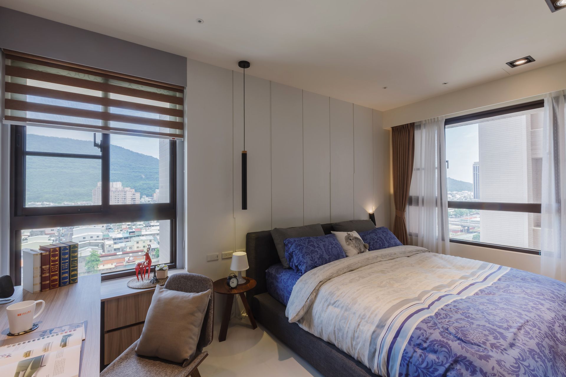 私領域規劃著重舒適與寧靜,臥室以柔和木色與暖光營造放鬆氛圍,搭配簡約線條家具與整合式書桌機能,滿足休憩與工作的雙重需求。整體設計在機能與美感間取得平衡,打造兼具實用性與品味的理想居所。