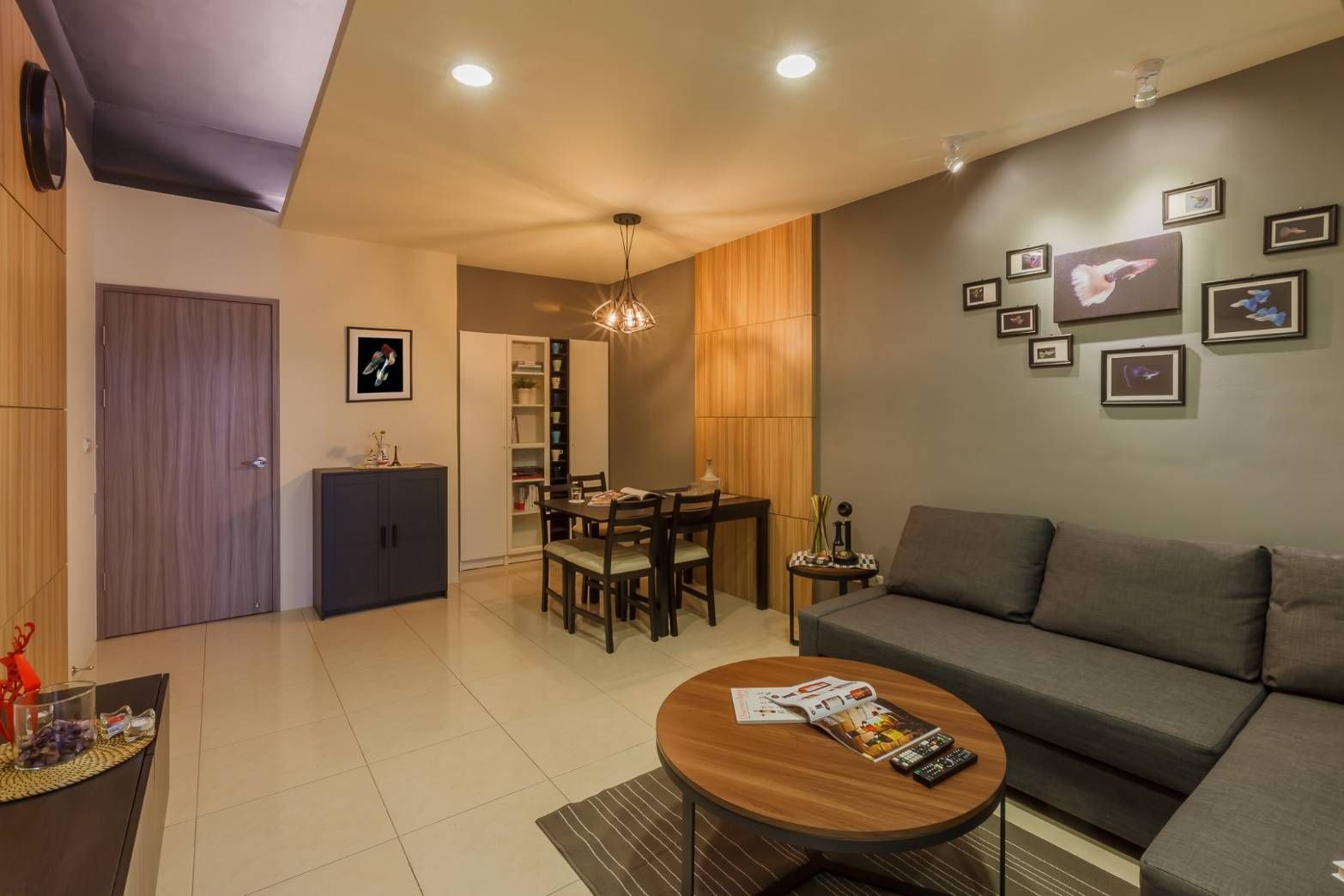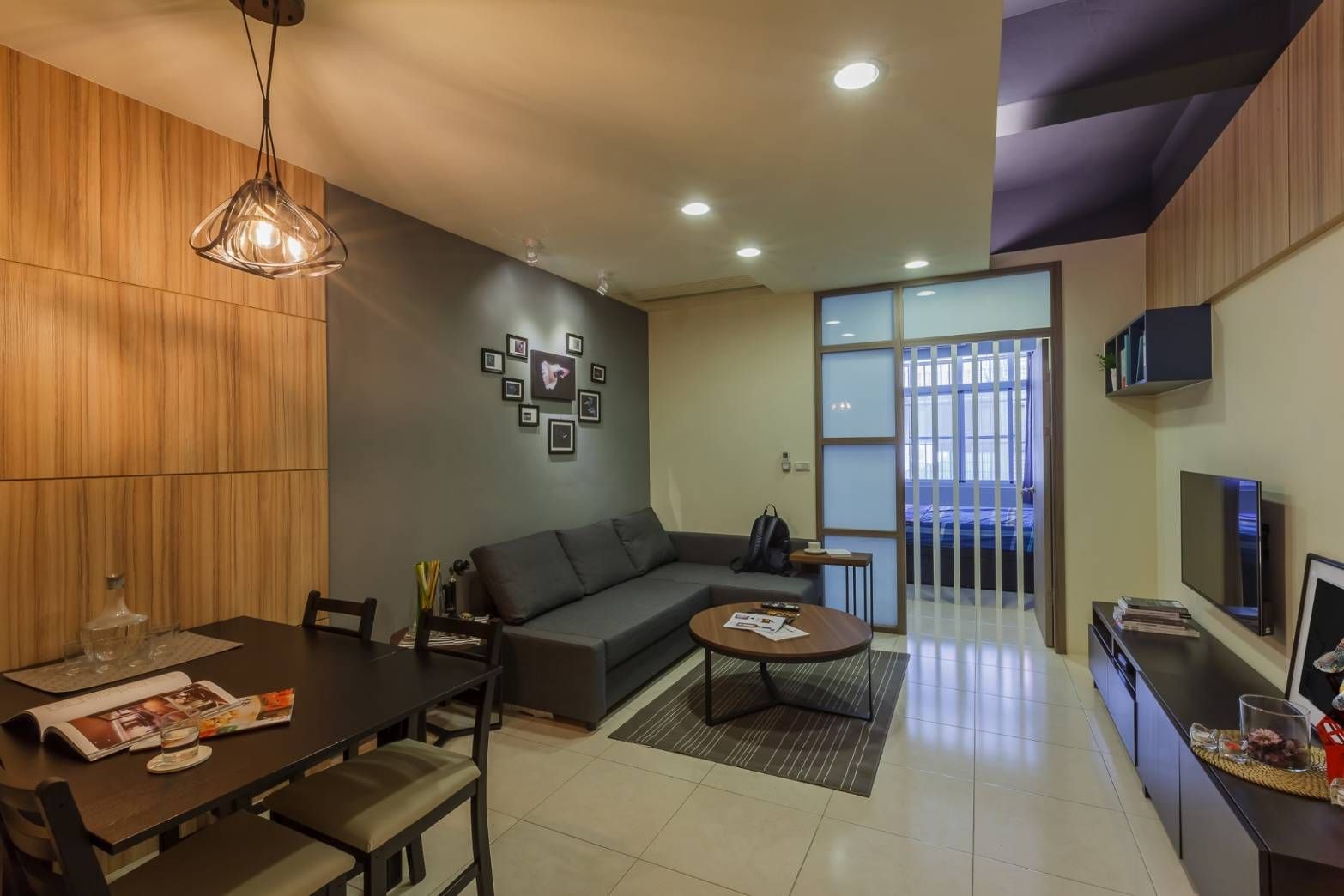 本案以溫潤木質與沉穩色調鋪陳空間氛圍,透過細膩比例與層次堆疊,營造安定而富有質感的居家表情。客餐廳以木皮立面作為視覺主軸,搭配深灰沙發與鐵件吊燈,展現內斂卻不失個性的風格語彙;餐桌與展示櫃形成端景,讓生活收藏成為日常風景。