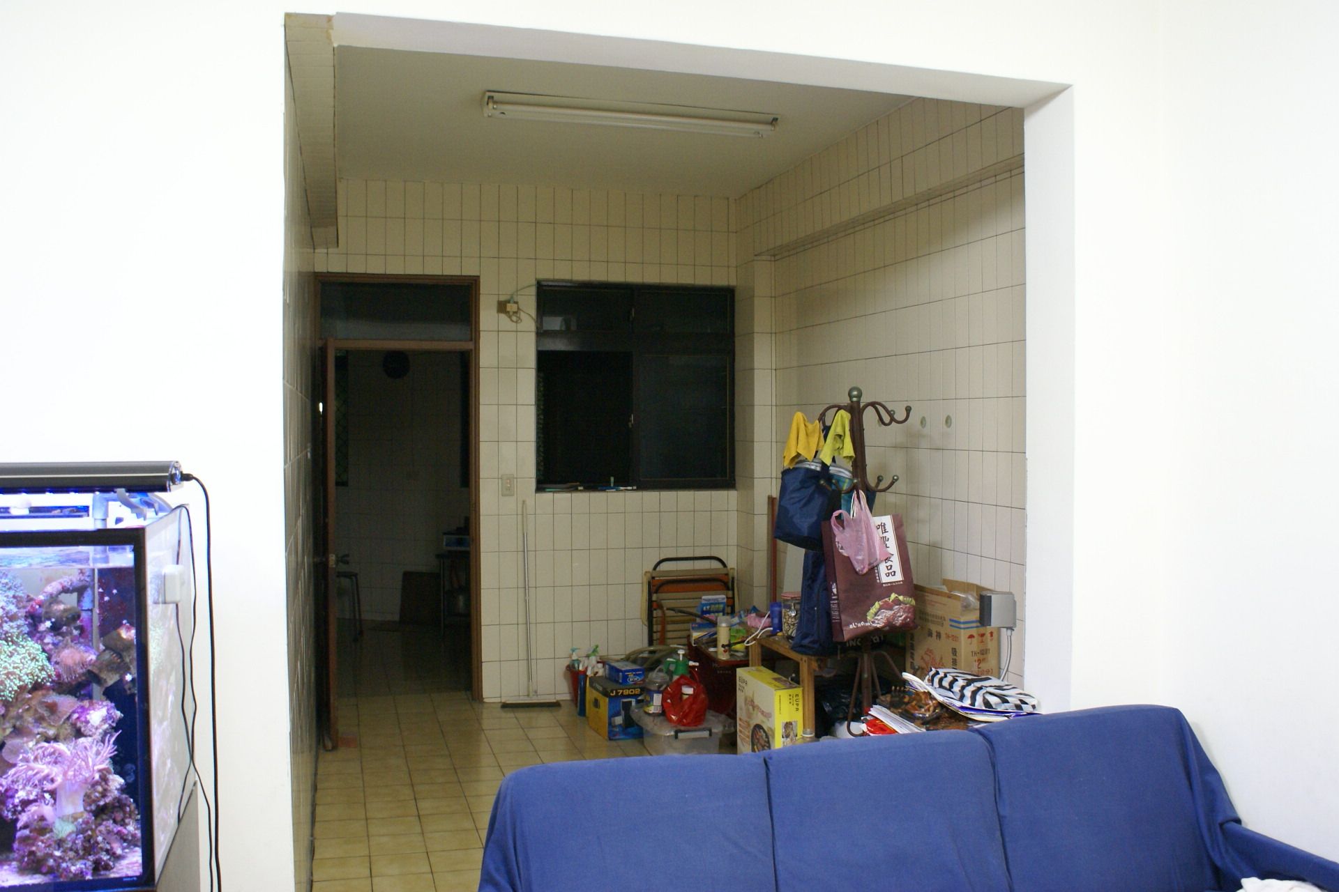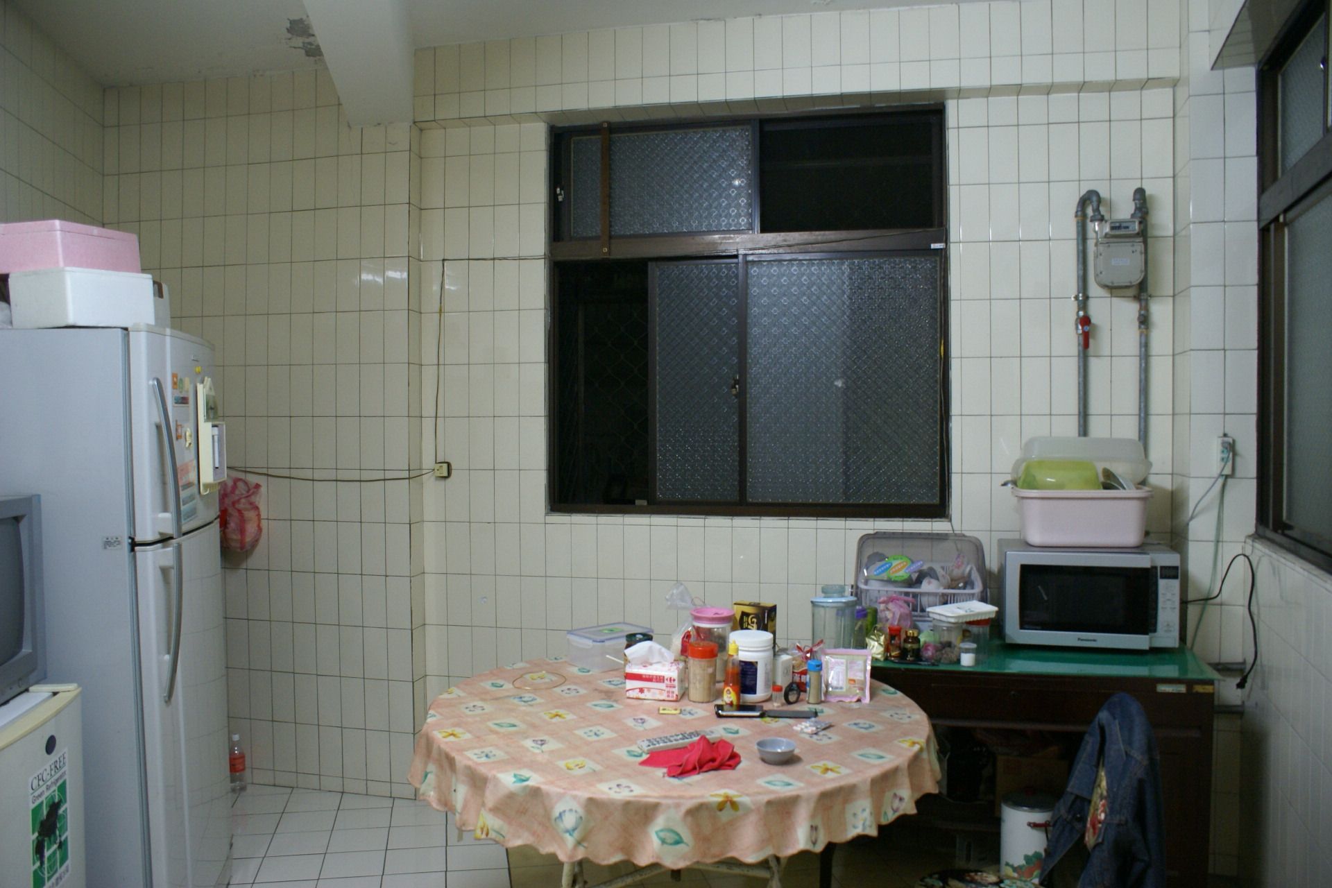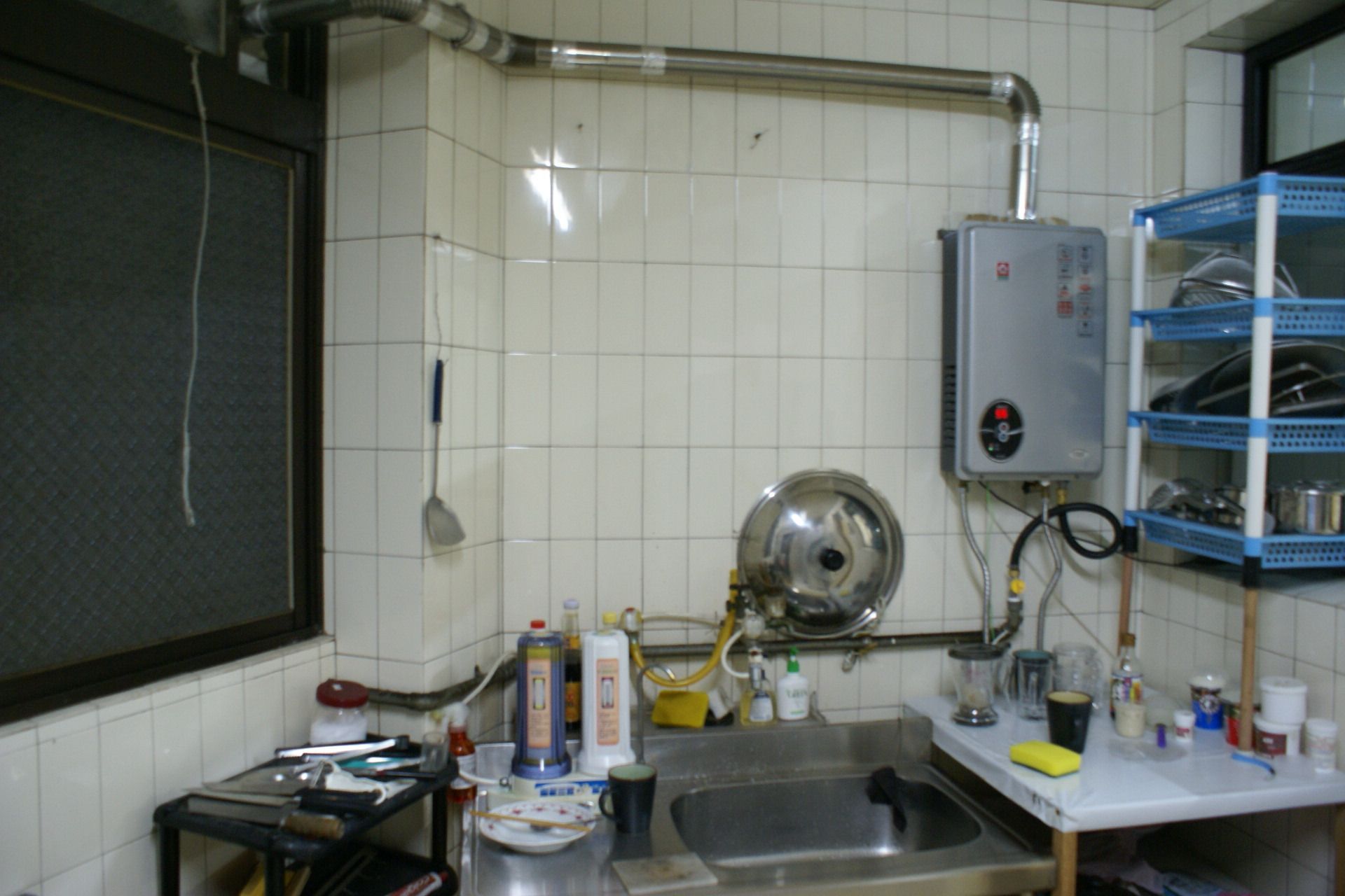 本案翻新前,空間保有傳統格局與磁磚牆面的配置。長形動線串連廚房與後方工作區,牆面與地坪皆為淺色磁磚鋪陳,機能雖完整,卻因收納不足與設備外露,使整體顯得零碎而壓迫。廚房設備沿牆配置,管線與熱水器裸露於牆面,檯面物品堆疊,缺乏整體規劃;餐區則以機能擺放為主,空間界線模糊,採光雖充足,卻未被有效運用。整體氛圍偏向實用取向,少了生活感與溫度。