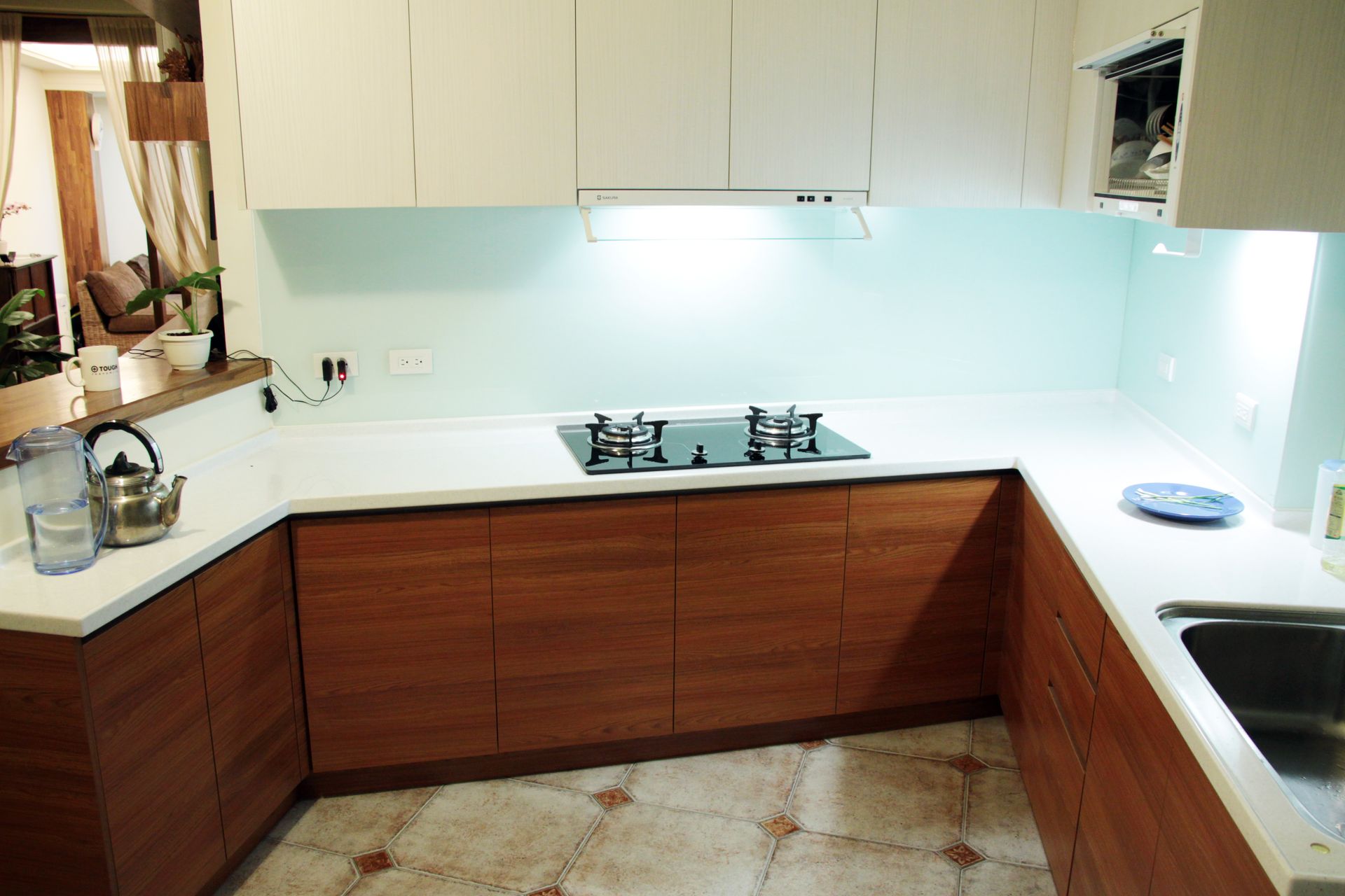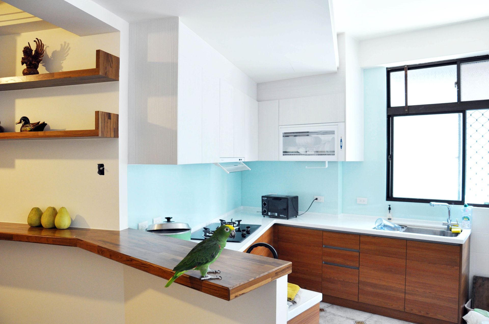 廚房則改為L型動線配置,重新整合設備與收納機能,隱藏管線、整合櫃體比例,讓視覺更加俐落。淺藍色防濺板為空間注入清新氣息,搭配白色檯面與深色木紋櫃體,形成溫潤與清爽並存的平衡。相較於翻新前檯面堆疊、機能分散的狀態,如今透過分區規劃與尺度拿捏,使操作動線更加順暢,收納也更為完善。