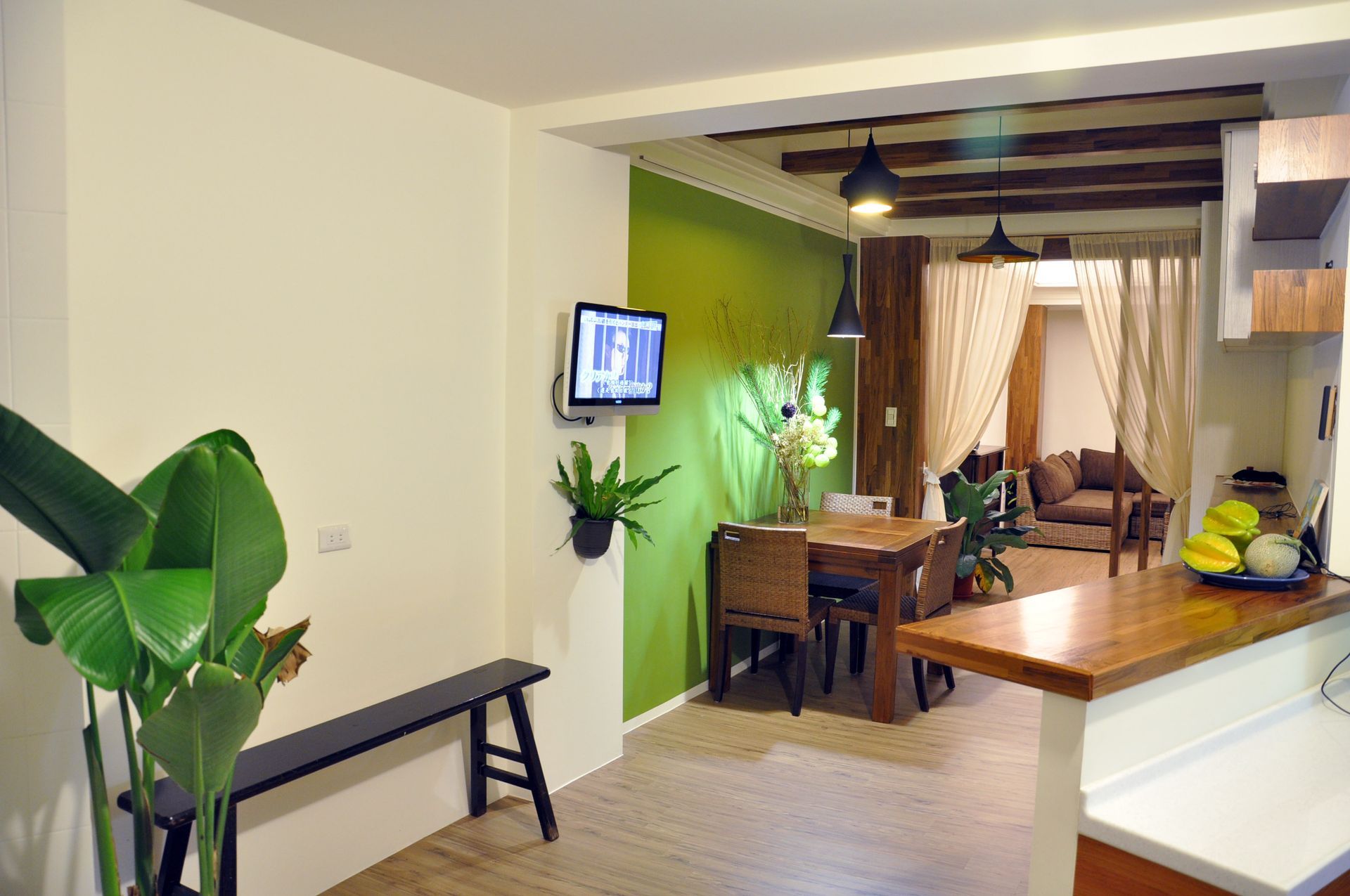 客餐廳以綠色主牆為視覺焦點,取代舊有單一磁磚立面,注入自然氣息。搭配植栽與木質家具,營造貼近生活的舒適場景。天花板加入木質橫樑語彙,與吊燈相互呼應,修飾原有結構線條,同時提升空間溫度。大面窗景則被重新整理與強調,使日光成為空間的重要元素,隨時間流轉映照出不同光影層次,讓原本單調的牆面與地坪展現更細膩的表情。