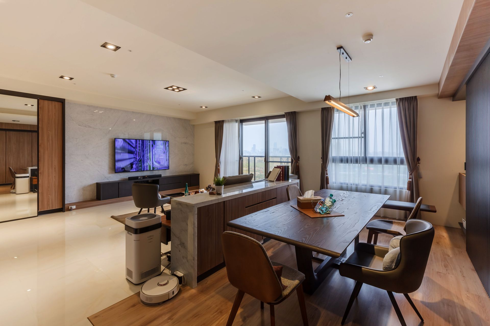 本案以沉穩人文風格為設計主軸,揉合溫潤木質、石材紋理與細膩燈光層次,營造富有質感的生活場景。公共空間採開放式布局,客廳與餐廳串聯延伸,大面窗景引入自然光線,搭配柔和窗紗與暖色照明,使空間在日夜之間展現不同表情。材質間的深淺對比,勾勒出優雅而內斂的居家氛圍。