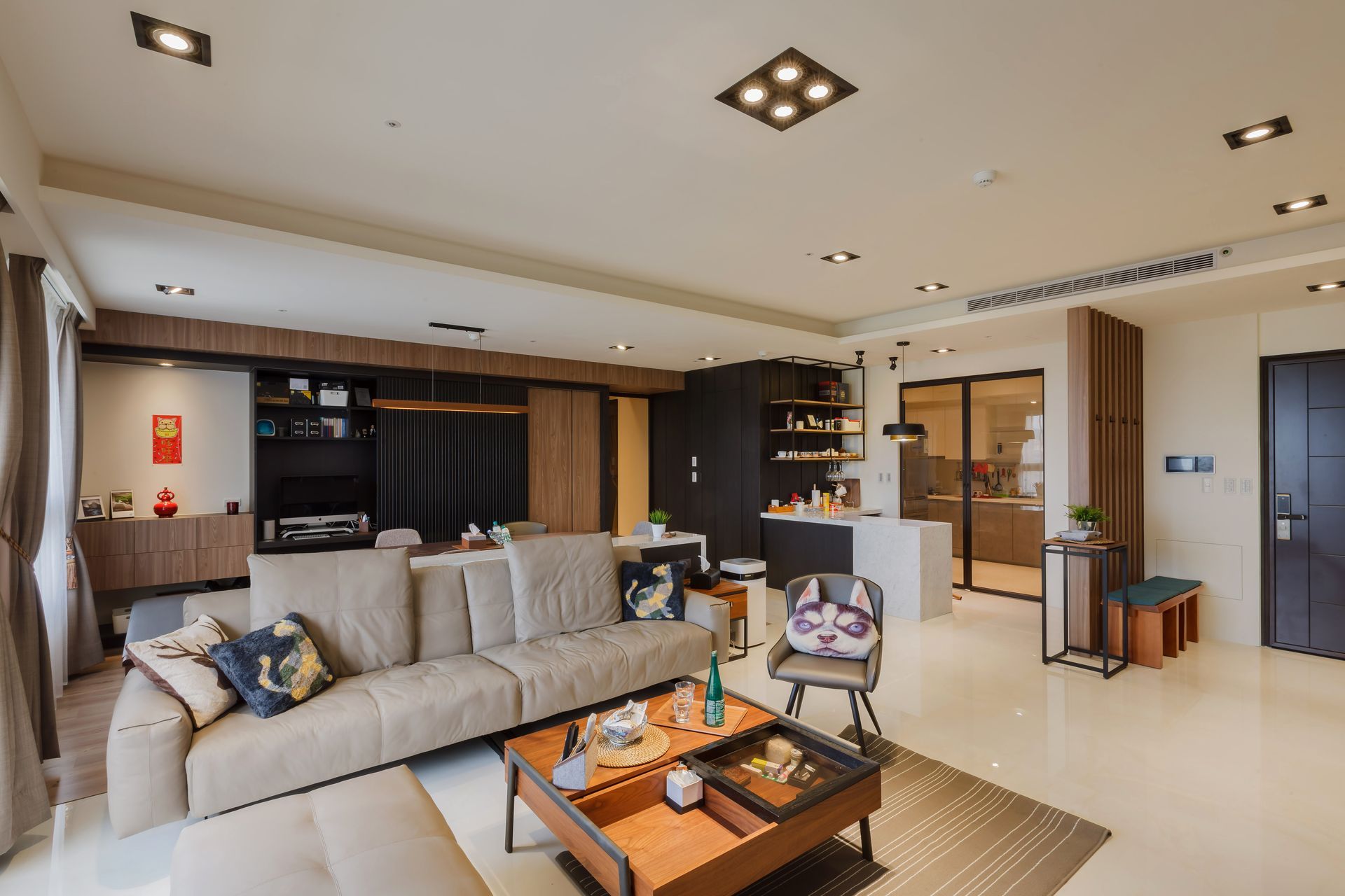 整體格局以通透玻璃拉門串聯公私領域,保有光線流動與視覺延伸,同時兼顧隱私需求。設計團隊以材質對比與燈光層次為核心,揉合木質溫度與金屬線條,塑造兼具品味與生活感的居家樣貌,讓空間成為承載日常與情感的理想場域。