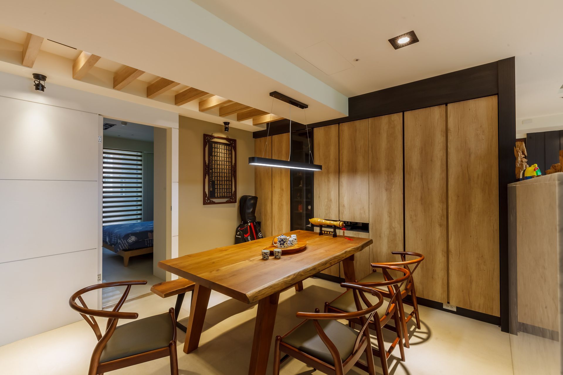 餐廳以厚實原木長桌為核心,保留天然紋理與不規則邊緣,展現質樸而真實的材質魅力。立面結合收納櫃與展示層架,藉由燈光烘托擺飾細節,讓機能融入美感之中。懸吊燈飾以圓潤造型柔化線條,搭配深色框架與淺色櫃體,構築出溫暖而富層次的用餐場景,成為家人交流情感的重要舞台。