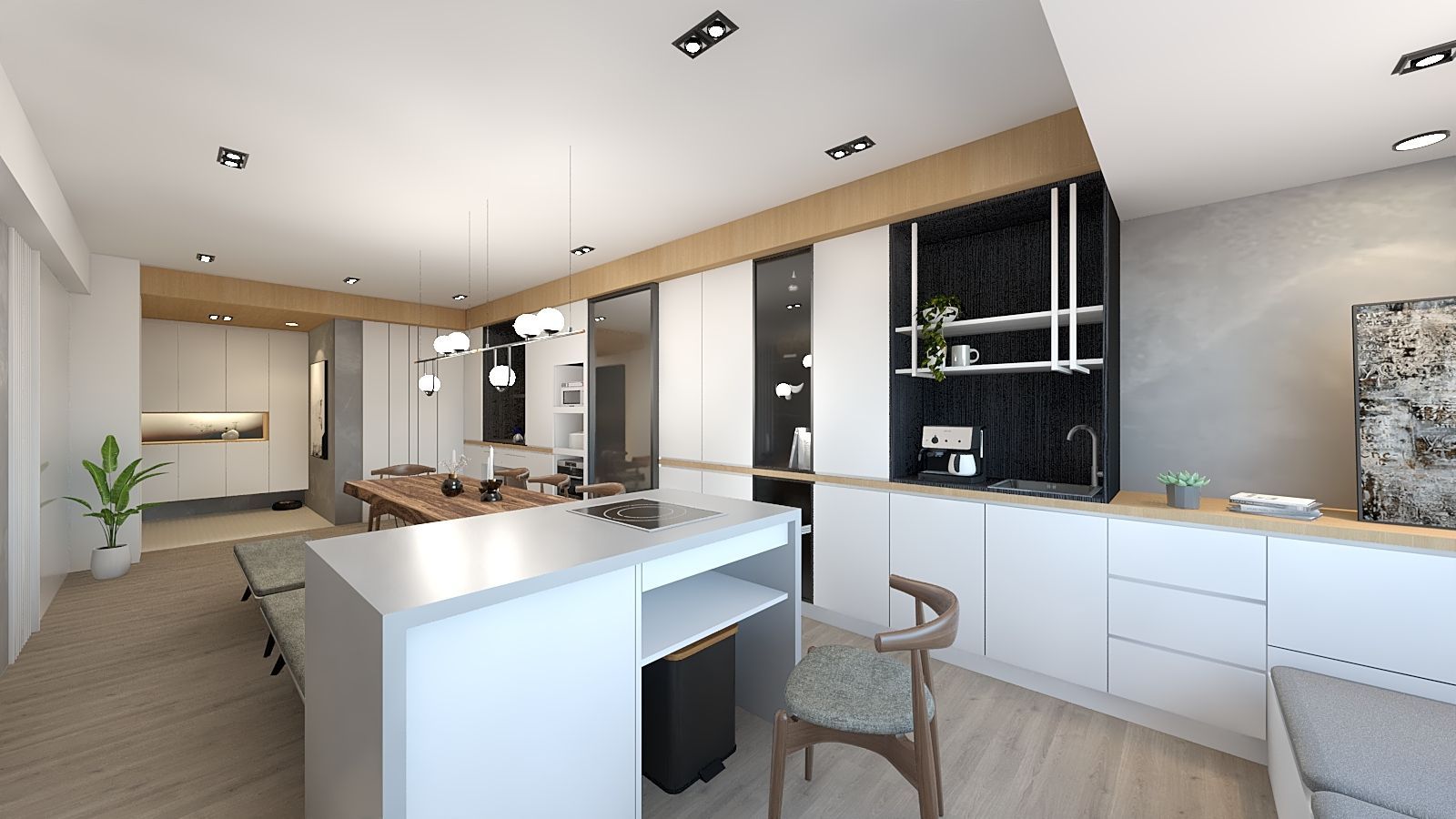 機能規劃強調收納與展示並重,整合式櫃體與層架設計,使電器與生活用品各得其所,同時保有整潔視覺。材質上運用木質、鐵件與霧面板材交織層次,透過細節堆疊提升質感。局部跳色與植栽點綴,為空間注入自然氣息與生活溫度。